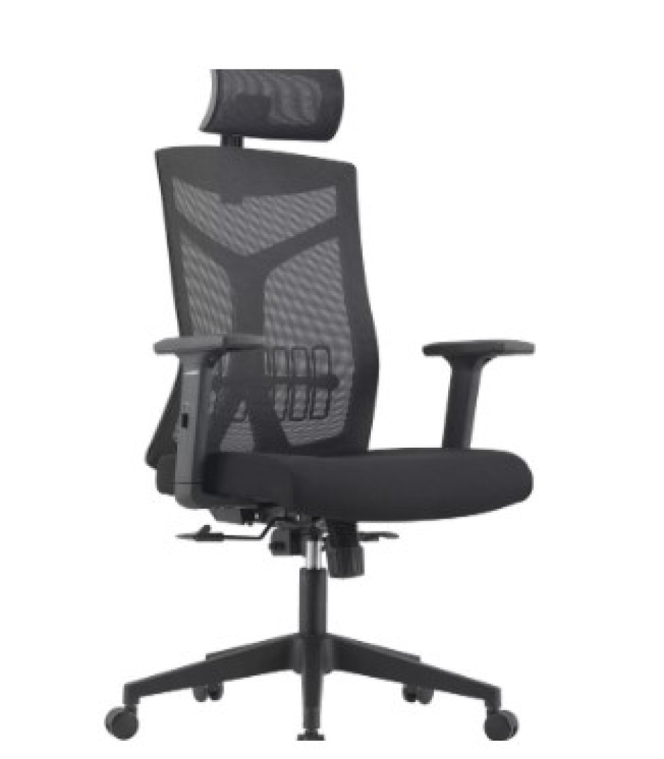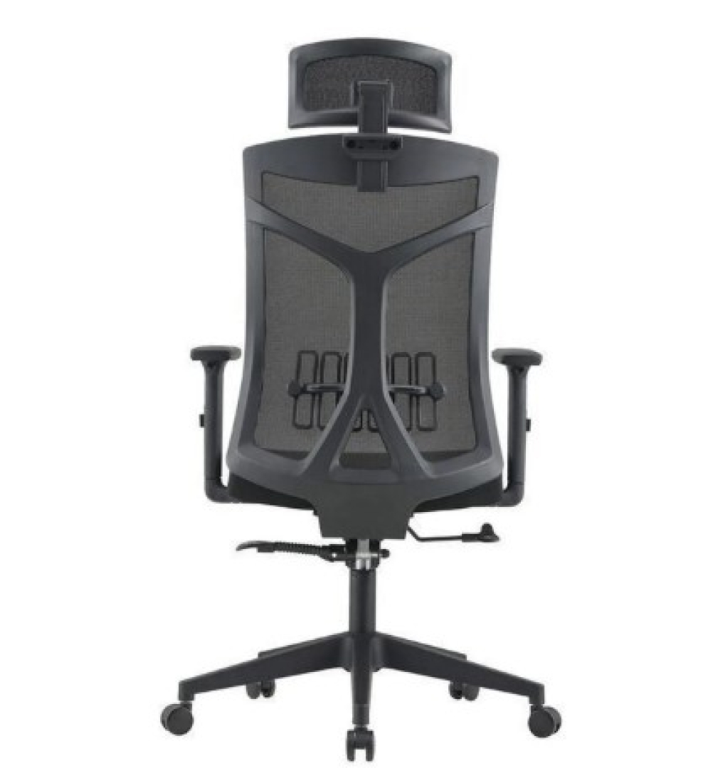 Encosto de tela Mesh, com apoio lombar e quadro estrutural em termoplástico injetado.