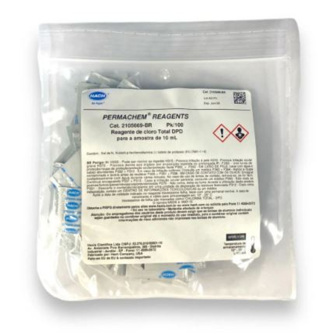 CLORO TOTAL REAGENTE DPD PP 10ML 100UNReagente para determinação de Cloro Total (Cl2) na faixa de 0,02-2,00 mg/L pelo método DPD . Método Hach 8167. Indicado para amostras de água, efluente, estuário e água do mar. Reagente em pó embalado em saches individuais (powder pillow) vedados com quantidade de reagente suficiente para amostras de 10mL. Reagente padronizado, pré-dosado, pronto para uso. Rápida dissolução e não gera turbidez Embalagem: pacotes com 100 sachês. Aparência: pó branco ou rosa claro, inodoro. Solúvel em água e ácido.