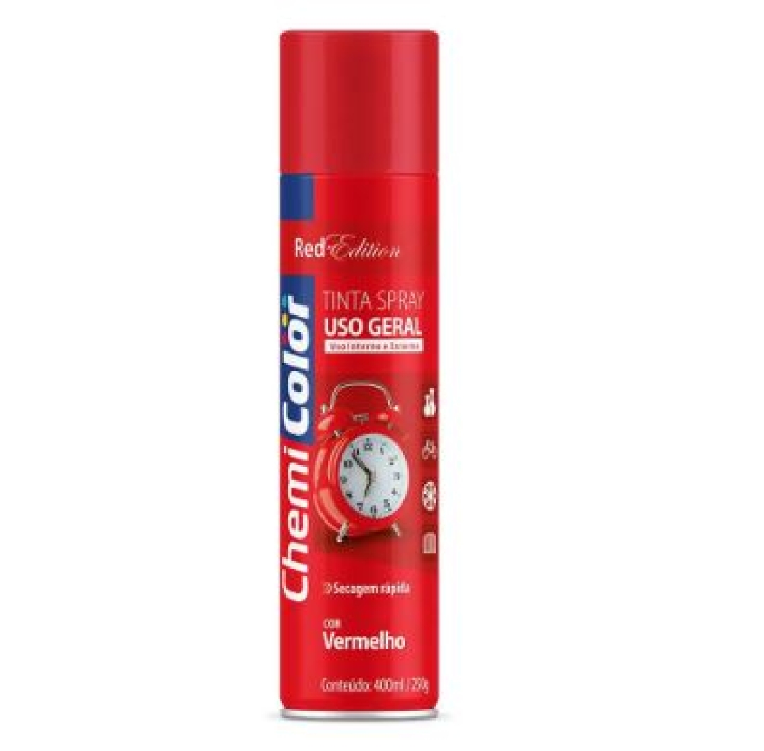 Tinta spray de uso geral 400ML/250G ChemicolorA Tinta Spray Chemicolor - uso Geral é elaborada com produtos de alta qualidade. Indicada para uso nos mais diversos tipos de pintura, podendo ser usada tanto em ambiente externo como interno garantindo uma boa cobertura e acabamento excelente, com alto rendimento e secagem e com cores que proporcionam ótimo efeito decorativo. A tinta Spray Chemicolor pode ser utilizada em diversas superfícies como: metais, cerâmica, vime, gesso, madeira, MDF, móveis, etc.